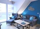 Ein 180x200 cm großes Boxspringbett finden Sie im ersten und im zweiten Schlafzimmer im Dachgeschoss. In beiden Schlafzimmern stehen Ihnen jeweils ein Flachbild-TV zur Verfügung. Stauraum für Ihr Reisegepäck finden Sie in den maritimen Sideboards.