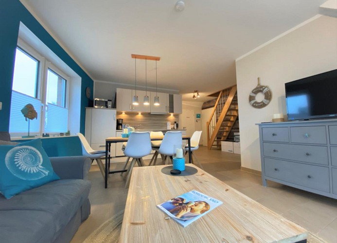 In dem hellen und komfortablen Wohn-, Esszimmer haben Sie die Möglichkeit, es sich auf dem bequemen Sofa gemütlich zu machen und einen gemütlichen Fernsehabend auf dem Fernseher in HD-Qualität zu genießen. Vom Sessel aus eröffnen Sich Ihnen Weitblicke bis über den Deich. Falls das Wetter mal nicht so gut sein sollte, wird eine Bücherauswahl für Abwechslung sorgen.